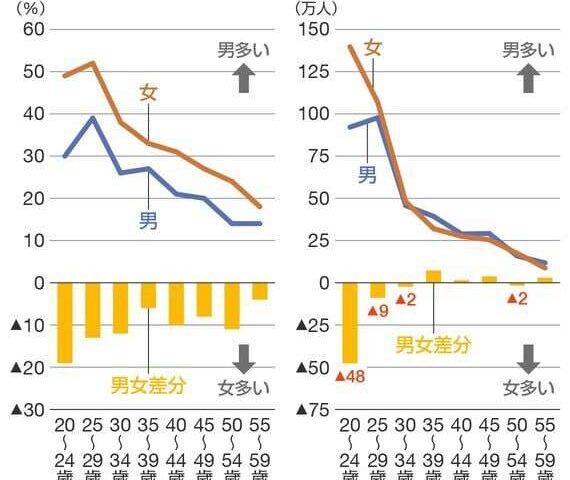 20代に関しては、男より女のほうが断然多く、20代では50万人以上恋人のいる女性が多いということになります。これは、男性の二股か不倫関係、もしくは「付き合っていると思っているのは女性側だけ」という思い込みと考えられます。