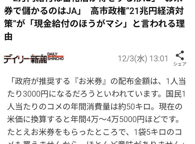 【悲報】おこめ券さん、5キロの米すら手に入らない欠陥券だったwww
