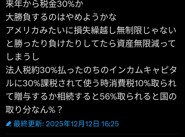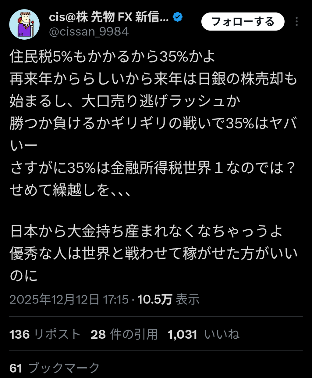 cisさん「高市早苗、良いね」高市早苗「株の税金35%にする」cisさん「もう株辞めようかなぁ」
