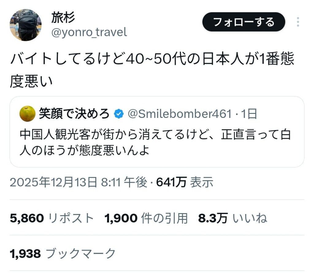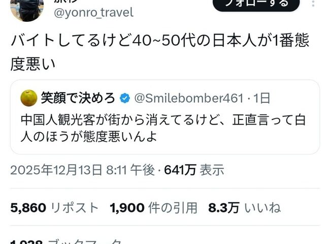 【悲報】アルバイター「中国人より40~50代の日本人が一番態度悪い」←8万いいね