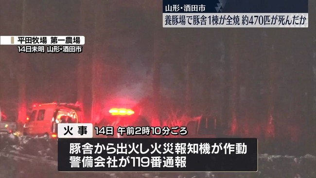 酒田市の養豚場で火災、豚470頭が巻き込まれたか…豚舎1棟を全焼