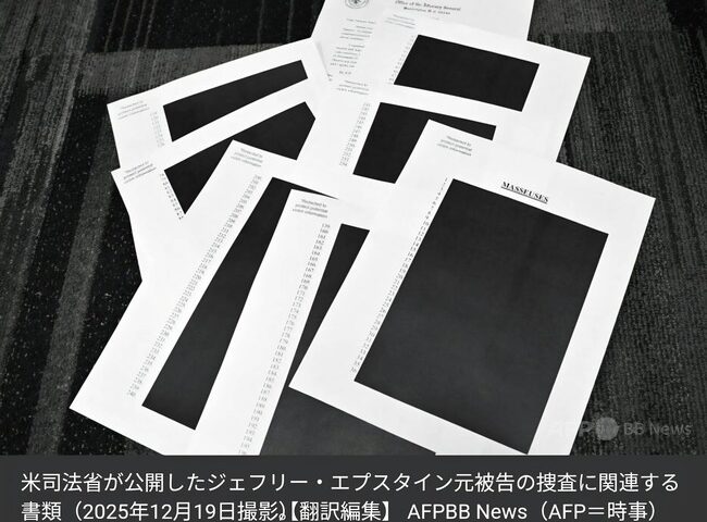 【AFP=時事】少女らへの性的人身取引の罪で起訴され、勾留中に自殺した富豪ジェフリー・エプスタイン元被告に関する一部記録が19日に公開された。しかし、多くのページが黒塗りされ、写真も検閲されているとして、不満や怒りの声が上がっている。
