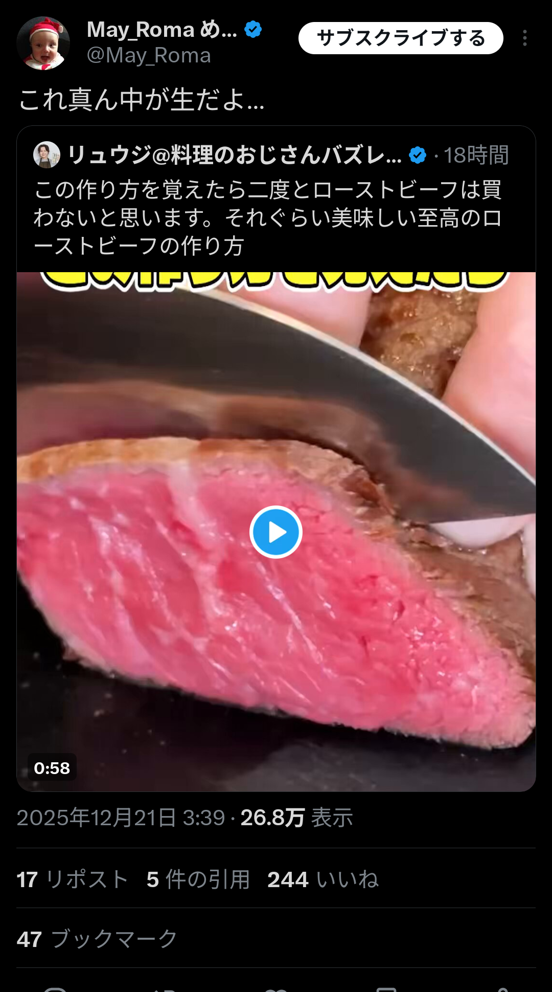 リュウジ「俺のローストビーフ覚えたら他のは食べられないよ」心無い人「これ生肉じゃん…」