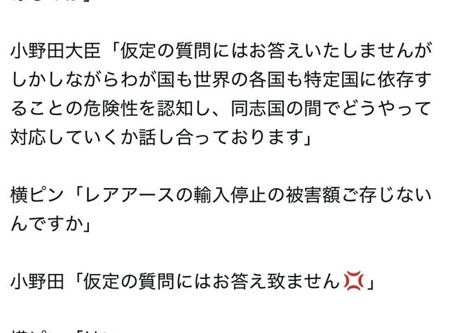 記者「レアアースが輸入停止になった時の対応策はあるのか?」小野田紀美「仮定の質問には答えません」