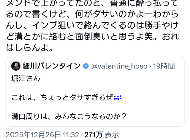 【悲報】細川バレンタインさんと堀江貴文さん、レスバ開始
